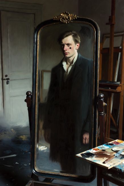 画家海因里希以极度写实著称。他最近刚完成了一幅自画像,画中的他坐在画室里,背后是一面巨大的落地镜。
