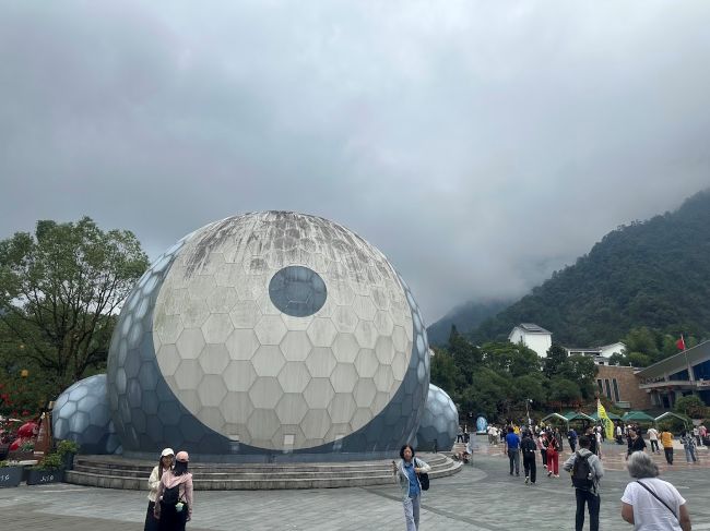 上到缆车顶部,是一个开阔的平台。首当其冲的是一个现代球形体,青灰色的底色正好和云雾相融,白色的圆形中又套着青灰色小圆。这和道教的黑白阴阳鱼形状不一样,青白色在这里又代表什么?