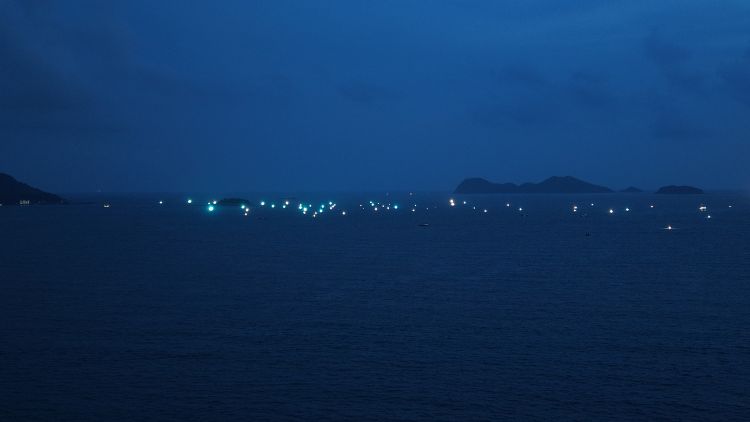 微信中见老友拍摄的月亮湾夜钓鱿鱼灯火,步韵伟人《浪淘沙·北戴河》,戏做《浪淘沙·月亮湾》记之。